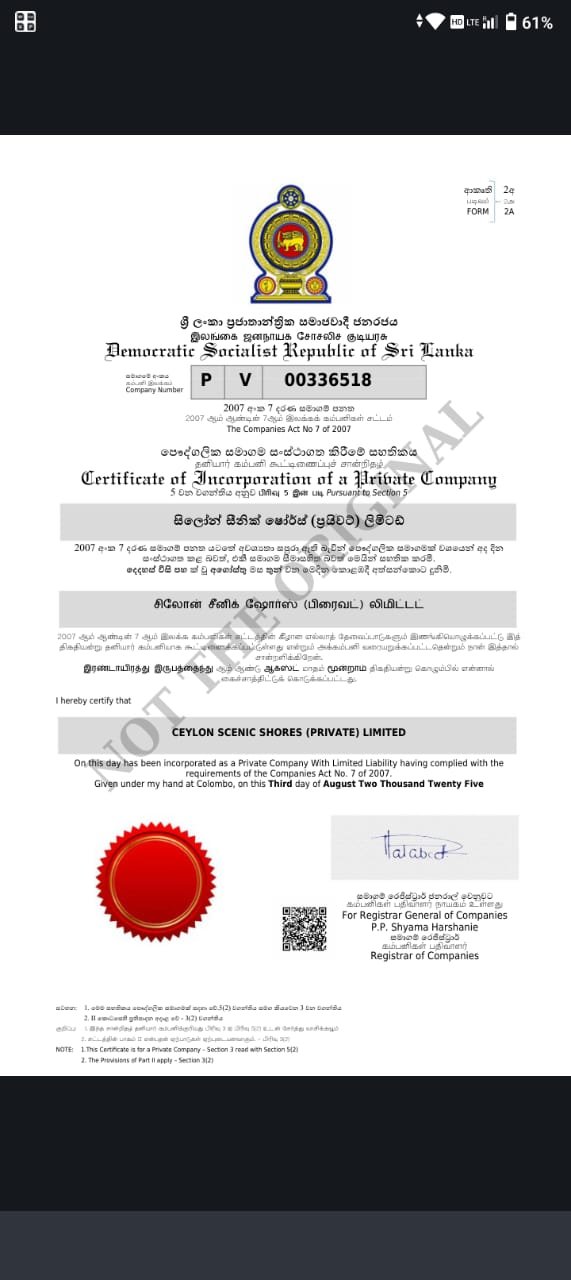 Ceylon Scenic Shores Pvt Ltd , Registered in Sri Lanka.